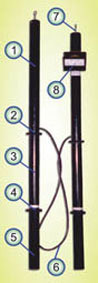 Устройство УПП-10 (рис. 1) состоит из двух полых штанг из стеклотекстолита. Внутри них размещены элементы электрической схемы. Рабочая часть устройства 1 (участок от контактного вывода до ввода высоковольтного провода) отделена разделительным кольцом 2 от изолирующей части 3 (участок от высоковольтного провода до упорного кольца 4 рукоятки 5). Штанги соединены гибким проводом 6 в высоковольтной изоляции, сохраняющей гибкость при температуре до –70 ˚С. На концах штанг предусмотрены контактные выводы 7 для касания шин в электроустановках. К одной из штанг прикреплен стрелочный индикатор 8.