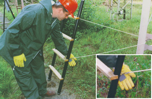 Для исключения травм и аварий при случайном расширении рабочей зоны, особенно в ОРУ электрических станций и подстанций, лестница может комплектоваться фиксирующим приспособлением КЛУС, в состав которого входит гибкий фал с проушинами и зажимом. С помощью этого приспособления приставная лестница крепится к конструкциям рабочего места: пасынкам, опорам, балкам и т. д. (рис. 2).